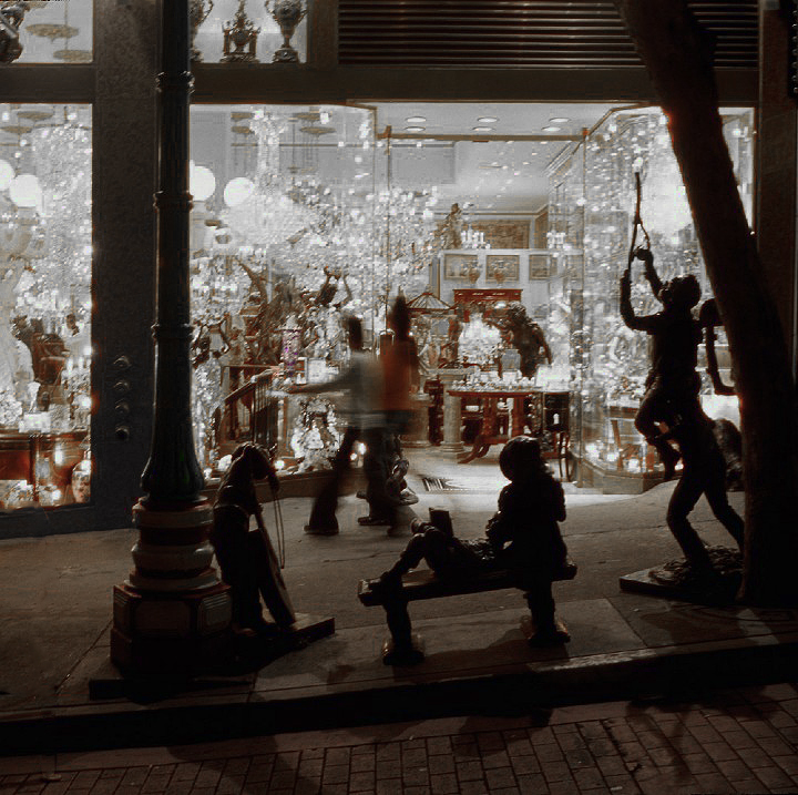 Soon it will be time to set the clocks back an hour to adjust for Daylight Savings Time. This means the sun will set earlier and when I walk out of the Library where I work it will be dark. I guess this means it is time to play at being a night photographer like Michael Kenna or (to go back further in history Brassai). I must admit it is very easy to shoot night photographs with my little digital camera. With film there would always be lots of color correcting but with my Lumix I set it to daylight if there are no buildings or sources of artificial light or to tungsten (and tweak using the WB tool extension in the Lumix camera) if there are buildings and such that will be significant elements in the photo. I set the iso to 800 or 400 and shoot. The photo of San Franisco above was taken with my Contax G2 and Kodak E100 GX slide film. The original slide is very yellow due to the lights in the store in the background. This is after color correction and cropping in Photoshop.